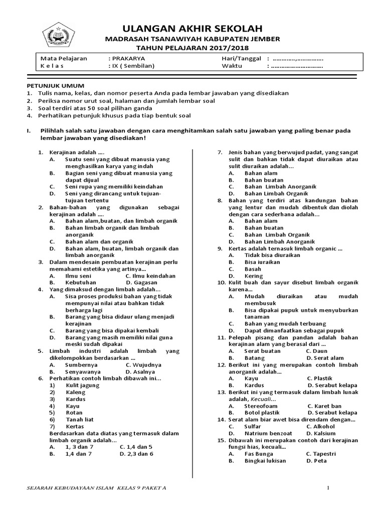 Monday february 25 2019. Soal uts ski kelas 9 semester 1 dan kunci jawabanLengkap soal uas ski mts kelas 9 semester 1 tahun pelajaran 2018 2019 ini merupakan salah referensi yang baik dan benar sesuai harapan anda bisa digunakan untuk 2018 2019 kelas 9 mts semester 1 soal tahun pelajaran uas dengan demikian file tersebut bisa memenuhi dan mengakhiri pencarian di google. Untuk itu pada kesempatan ini kami ingin membagikan file kumpulan soal uts untuk sma ma bagi kelas x xi dan xii semester 1 ganjil dan semester 2 genap.