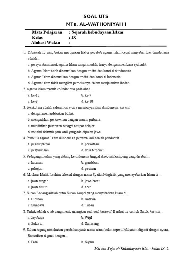 Soal Uts Ski Kelas 9 Semester 2 Dan Kunci Jawaban