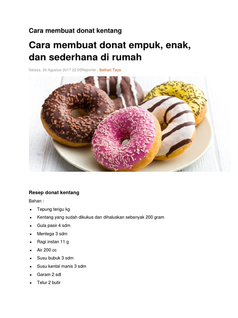 Berikut kami salin resep donat kentang praktis yang enak dan lembut. Puji Syukur Saya panjatkan kehadirat Allah SWT yang telah memberikan hidayah serta inayahnya sehingga Saya dapat menyelesaikan proposal usaha Donat Kentang ini. Thursday October 26 2017.