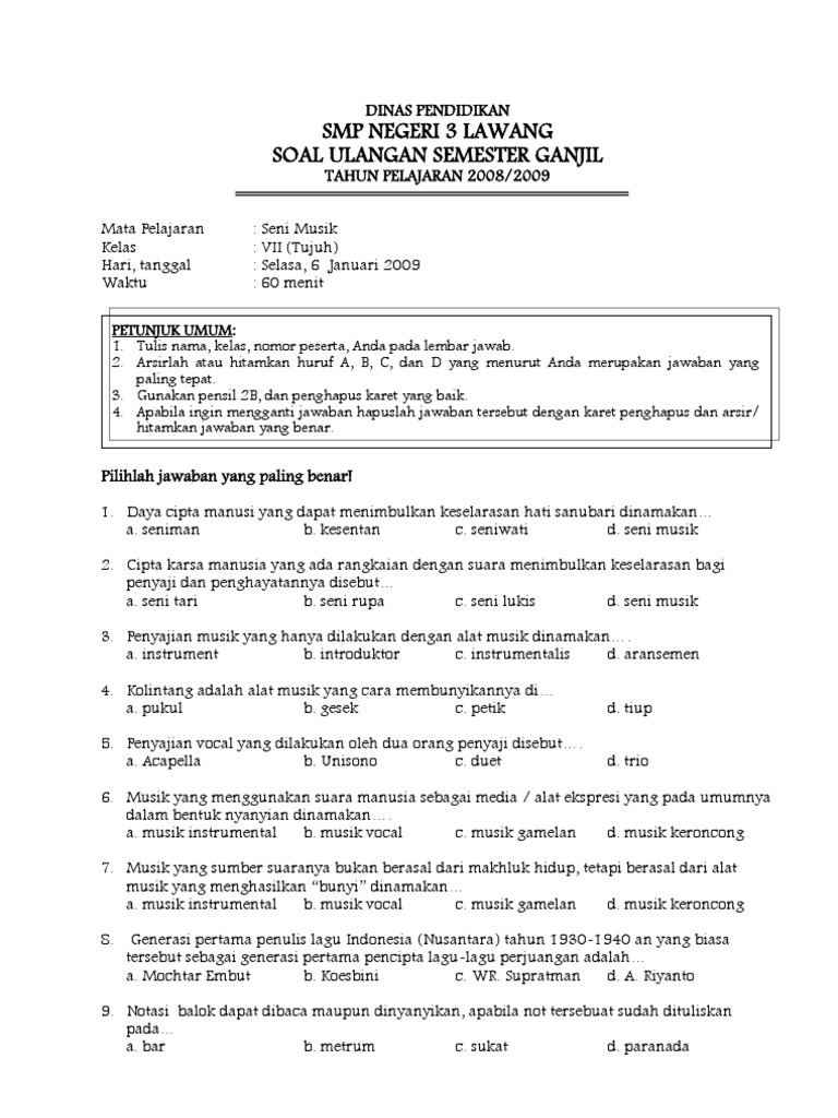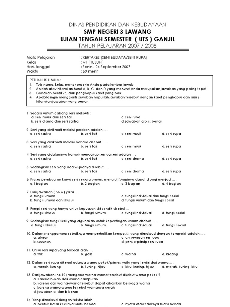 Soal Ujian Mid Semester Ii Seni Budaya Kls Vii 2014