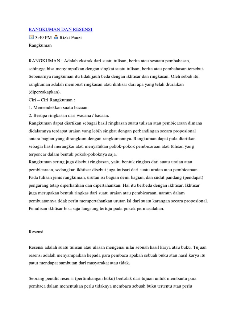 Kata resensi ini berasal dari bahasa Belanda recensie yang berarti membicarakan dan menilaibeorordelend en bespoken. Apa yang membedakan ketiganya. Ringkasan adalah salah satu bentuk karangan ilmiah singkat yang berasal dari karangan ilmiah yang panjang.