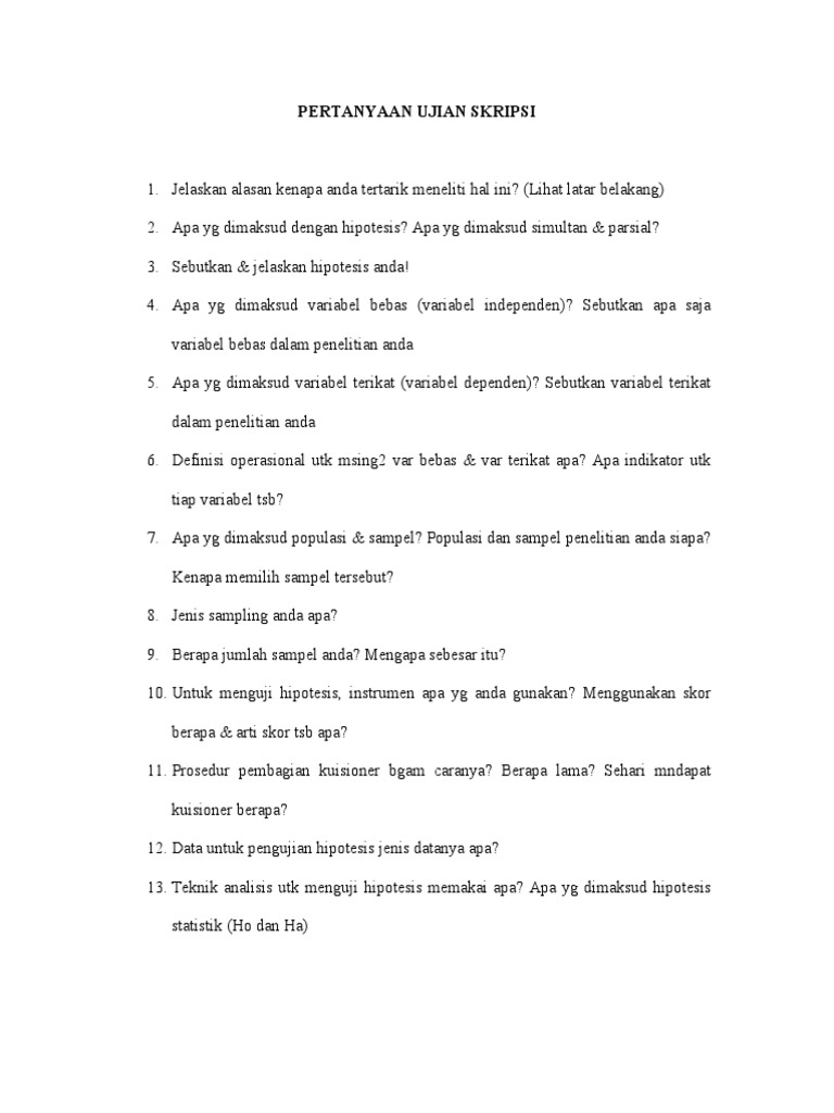 Jika Sobat ditanya mengenai judul skripsi atau penelitian yang Sobat lakukan pastikan untuk menjawab dengan jelas dan penuh percaya diri. Setelah selesai mendatangi sidang skripsi maka bisa melakukan simulasilatihan sidang skripsi kecil-kecilan di. Kisi-Kisi Skripsi PejuangskripsiKisi-Kisi Pertanyaan Sidang Proposal Skripsi dan cara menjawabnya atau 8 Pertanyaan yang sering muncul saat sidang skripsi.