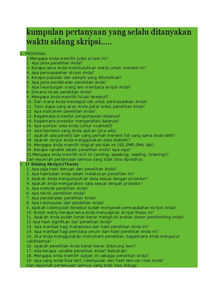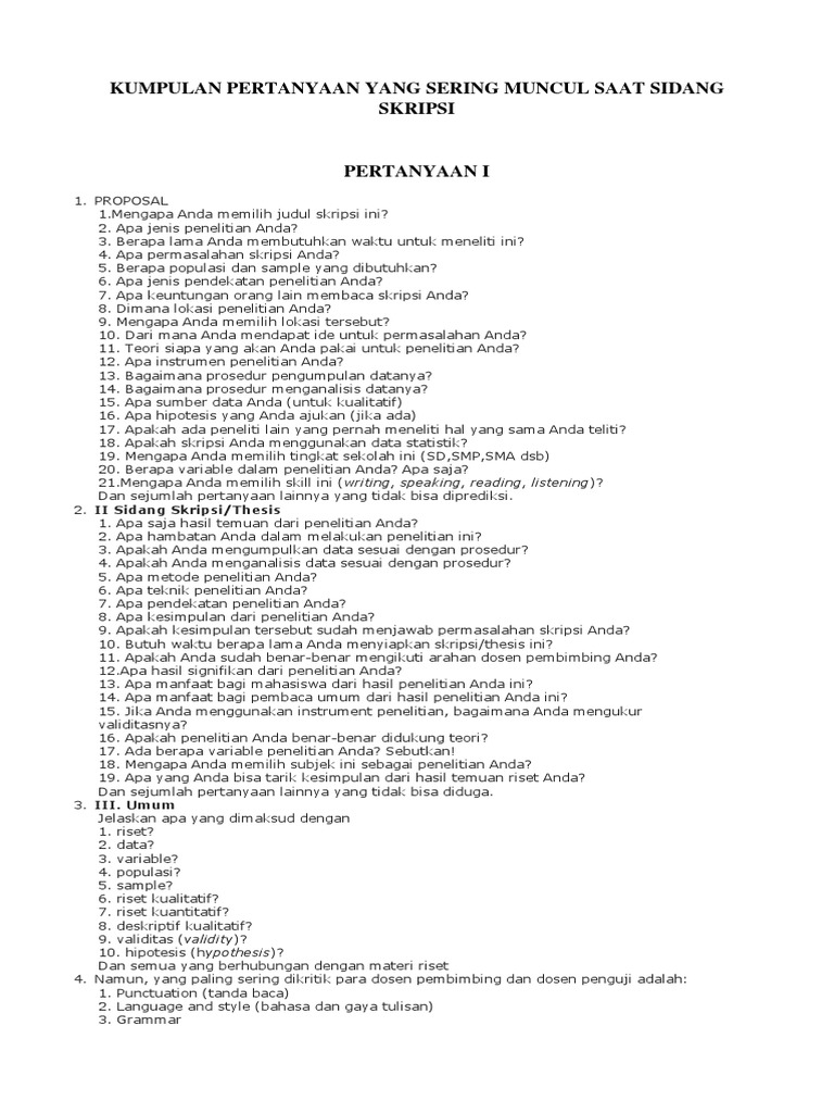 1Kesimpulan dari penelitian kamu apa. Pada dasarnya pertanyaan pada saat sidang proposal skripsi terbagi kedalam dua jenis yaitu pertanyaan khusus dan pertanyaan umum. Pertanyaan khusus merupakan pertanyaan yang muncul ketika dosen penguji melihat adanya kekurangan pada proposal penelitian kita.