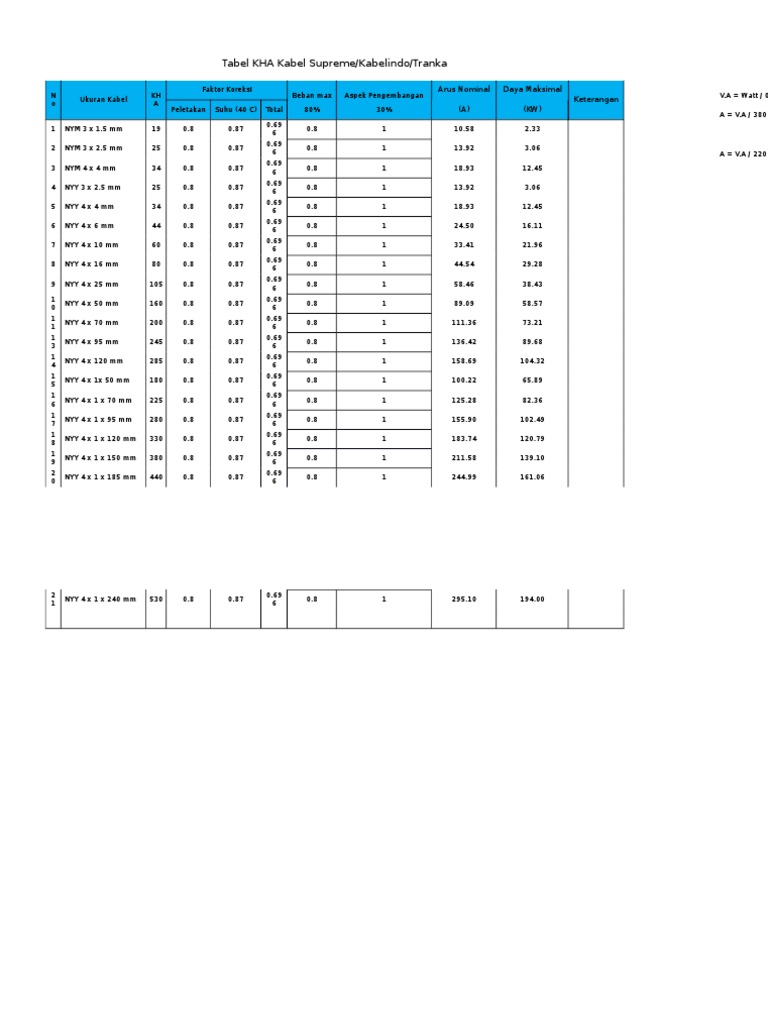 May 4th 2018 - Tabel KHA Kabel Supreme Kabelindo Tranka N o Ukuran Kabel KH A Faktor Koreksi Beban max Aspek Pengembangan Arus Nominal Daya Maksimal Keterangan tabel Kha Kabel Aaac Huatong Cable Htabccable Com. Daftar ukuran kabel supreme nyy found at groundrodindonetworkco. Daftar Harga Kabel merk Supreme murah 100 original dan berkualitas tinggiTokoSparepartcoid merupakan bagian dari PT.